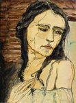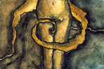 2007Voorontwerp van pre-logische tabulatietechnieken op basis van klankclusters (cfr Velimir Chlebnikov's Zangezi). Marie's Water Colours,zwarte viltstift en een dubbele laag bootvernis op papier.